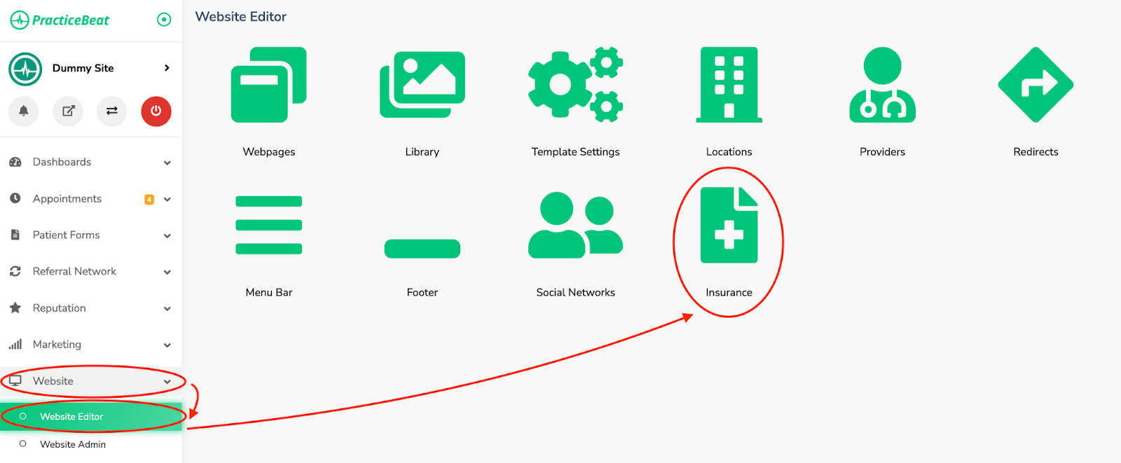 Click “Website Editor”; on the right, a tab with an icon titled “Insurance” will appear; click on “Insurance”.